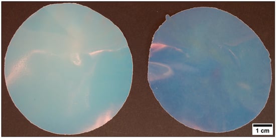 Compared to the particle films derived from polymethacrylate core-shell particles, PS has higher refractive index (nPS = 1.5916) causing a higher net refractive index contrast between the shell and the core material in the processed particle film. Consequently, the obtained hybrid particle films featured a weak iridescent reflection color (Figure 7). As a first result after application of the melt-shear organization technique, the optical impressions clearly pointed out that MPSEt is a suitable monomer for enabling the preparation of a hybrid and meltable shell for PS or PMMA core particles. This approach led to the formation of free-standing hybrid particles films with high transparency (in the case of PMMA as core material) or iridescent reflection color (in the case of PS as core material) after particle processing. The cross-linking reactions of the hybrid particle films after particle processing based on P(S-co-ALMA)@P(EA-co-MPSEt) will be elucidated in the following section, while morphological aspects and film properties will be investigated by SEM in Section 3.5.