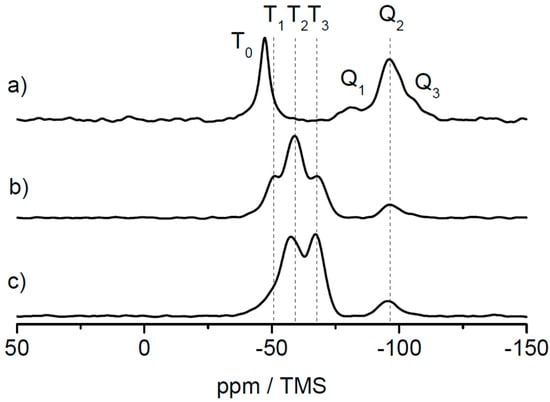 29Si CP MAS spectra of samples based on the MPSEt linker system in three different states: (a) lyophilized powder, (b) hybrid film, and (c) hybrid film after heat treatment, and signal assignment of Tn groups (n = 0, 1, 2, 3) and Qn groups (n = 1, 2, 3). Spectra were measured at 14 T at a spinning rate of 8 kHz.