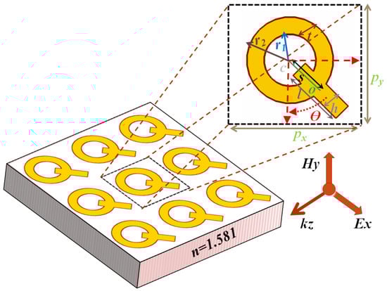 The array of ring/rod metasurface placed on a dielectric substrate is shown in Figure 1. Floquet boundary conditions as periodic boundary conditions are used to repeat the unit cell with a period of p = 180 nm along x- and y-direction as shown in the inset in Figure 1. The structure parameters are: the radius of the outer ring r2 = 50 nm, the radius of the inner ring r1 = 30 nm, the thickness of the ring t = 20 nm, the length of nanorod l = 70 nm, the width of the nanorod h = 20 nm, the thickness of gold material in −z to z direction is 20 nm, the angle of rotation of nanorod in the clockwise direction θ, the center of the ring c, the center of nanorod o, and the distance s between the center of the ring c and that of the nanorod, respectively. The structure is designed on the surface of 490 nm silica substrate having refractive index of n = 1.581. The nanostructure is embedded in air and is excited by x-polarized (0° incident angle) electromagnetic beam propagating in the z-direction, with unity power. The transmission properties of the metasurface are carried out by COMSOL Multiphysics 5.1 software with RF module. A Johnson and Christy data model has been used for the dielectric constant of the gold [38].