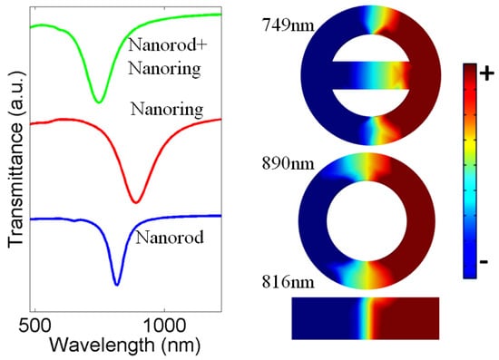 Transmittance spectra of nanorod (blue curve), nanoring (red curve), compact ring/rod (green curve) structures. Inset shows surface charge distributions of all the structures at their resonant wavelengths. Where red indicates positive and blue indicates negative.