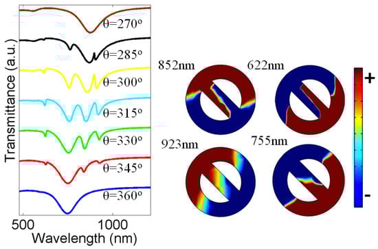 Now to split the transmittance spectrum of the theta-shaped metasurface, we rotate the nanorod in a clockwise direction. In this way, the effective dielectric constant of the nanorod will change, which further cause variation only in the effective refractive index of the nanorod. However, the effective refractive index of the nanoring does not change. Therefore, the wavelength of the resonant mode resulting from the nanorod will change, while the resonant wavelength yields from the nanoring will not change. As a result, Fano resonance due to the interference of the two modes with a small difference in frequency will occur. Figure 3 shows the transmittance characteristics of the theta-shaped structure for different values of θ. When we vary the angle from 360° to 345°, modes of different wavelengths supported by the nanorod and nanoring start coupling with each other yields the transmittance spectrum split and generate multiple modes. The intensity of modes increases by further rotating the nanorod in a clockwise direction. For instance, at θ = 315°, the newly excited modes look very prominent. To understand the nature of the modes, we calculated the surface charge density distributions as shown in the inset in Figure 3. All the modes show rotated dipoles because, when we rotate the nanorod, the dipole also rotates. It can be noted that the line shapes of the two newly excited modes at the lower energy side appear highly asymmetric, which represents Fano-like resonances. These Fano resonances emerge due to coupling of the broad mode with the two narrow modes. There is also a small mode located at 622 nm, which also represents a dipole mode. However, this mode is far ahead from the broad dipole mode, therefore coupling will not take place. By further decreasing the rotation angle θ, the intensity of the newly excited modes decreases and eventually disappears at θ = 270° because at this value of θ, the electric vector of the light is parallel to the nano metallic rod and the light will be completely absorbed. So, in this way, we can rotate the dipoles as the transmittance characteristics of the metasurface are extremely sensitive to the angle between the axis of the nanorod and the polarization vector of the incident wave. Such metasurface can be used for switching applications—i.e., to switch Fano resonances on and off. It should be pointed out, from the symmetry of the system it can be understood that the spectra for the angle in the ranges from 360 to 270, from 270 to 180, from 180 to 90, and from 90 to 0 are similar.