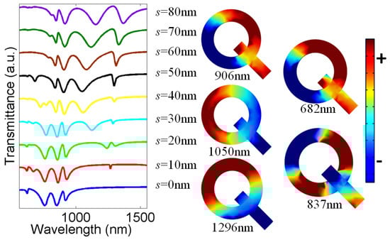 From Figure 4, it can be seen that the resonance wavelength becomes longer as s increases. This is because the effective length of the structure becomes longer, i.e., longer cavity and longer resonance wavelength. Furthermore, from Figure 4 it can be seen that there are four to five extra dips in the spectrum except the basic dip. This means that the difference between the two wavelengths interfering to have the Fano resonances leads to a phase difference of (4–5) × π because for each π of phase difference, there can be one Fano resonance mode. Moreover, from Figure 3 and Figure 4, it can be seen that the resonance wavelength for the Q-shaped structure is longer than that for the theta-shaped structure. This can be explained by noting that the Q-shaped structure has a longer effective length than that of theta-shaped structure.