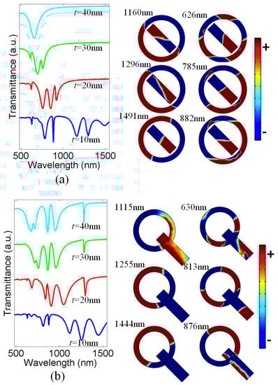 Next, we consider both the theta-shaped and Q-shaped structures and vary the thickness t of the nanoring. In both cases, we vary the internal radius and keep the external radius constant at r2 = 50 nm. Figure 5a shows transmittance properties of theta-shaped metasurface for different values of t. It appears that, by reducing the value of t, the transmission spectra gradually split into multiple modes. The spectrum characteristic in Figure 5a can be explained as follows: when decreasing t of the nanoring by increasing the inner radius of the nanoring, the effective length of nanoring will increase and thus the resonant wavelength of the nanoring will become longer. As a result, smaller t implies that larger times of π-phase difference can be generated between the resonance mode in the nanoring and that in the nanorod, and therefore more modes of Fano resonance appear. Furthermore, as t decreases, the resonant wavelength of the nanoring becomes longer and thus the Fano resonance modes shift to the longer wavelengths. The surface charge distributions calculated at each resonant mode illustrate that the nature of all the modes are similar, except the mode located at 626 nm shows an octupole pattern on the nanoring due to which this mode is a higher order octupole mode. Moreover, four Fano-like resonances with distinct asymmetric line shapes are also observed. The octupole mode at the low wavelength region will not participate in the formation of Fano resonances.