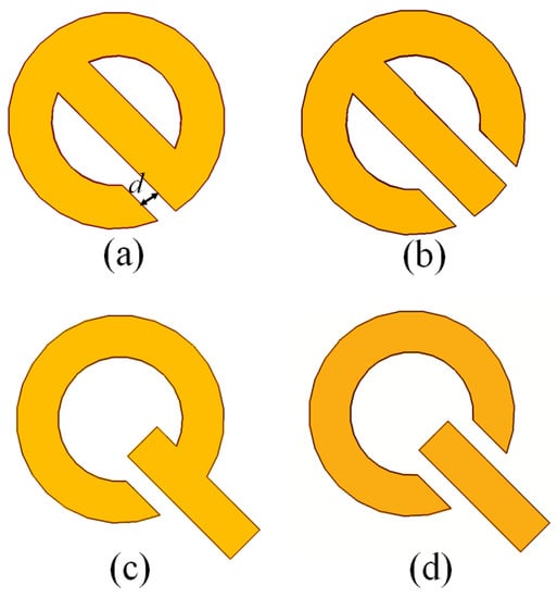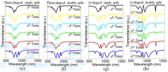 To further modify the transmission properties of the metasurface, we took the best cases from the previous sections and introduced another symmetry-breaking scheme as shown in Figure 6a–d. Here, we incorporate single and dual splits in both the theta-shaped and Q-shaped metasurfaces due to which the plasmon hybridization will occur between the nanoring, nanorod, and cavity modes. Figure 6e,f shows the transmittance characteristics of theta-shaped structure for different values of split size “d”. It appears that when d > 0 nm, the mode cancellation will take place—i.e., the cavity modes and theta-shaped metasurface modes strongly interfere destructively at many places. Therefore, creating splits in this theta structure is not a better choice. In contrast, the transmittance spectra of the Q-shaped structure given in Figure 6g,h are slightly changed with d. These results show that by introducing splits in ring/rod metasurface, no more multiple modes are excited in the transmittance spectra. However, in Q-shaped at larger value of d mode cancellation is not so high. This is so because the split is very narrow and thus has small influence to the resonant wavelength of the ring and thus less influence to the interference of the resonant modes. Table 4 reveals the single side Q-factor (Qss) and FoM values calculated around Fano resonances at d = 5, 7, and 9 nm for the theta-shape with a double split, Q-shape with a single split, and Q-shape with a double split. The highest Q-factor value in this case is obtained for the Q-shape with a single split which reaches around 117, while the highest value of FoM is calculated for theta-shaped with double splits, which is approximately 71.