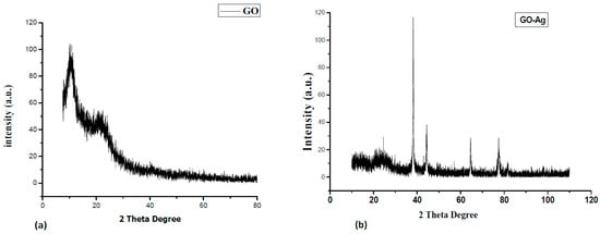 X-Ray diffraction (XRD) structure of (a) Graphene Oxide (GO) (b) Graphene Oxide-silver (GO-Ag) nanocomposites.