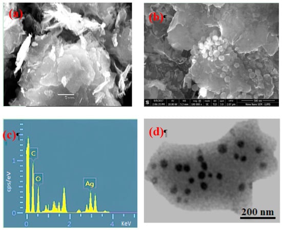 Scanning Electron Microscopy (SEM) analysis of (a) GO (b) GO-Ag nanocomposites (c) Energy Dispersive X-rays (EDAX) analysis of GO-Ag nanocomposites (d) Transmission electron microscopy (TEM) of GO-Ag.