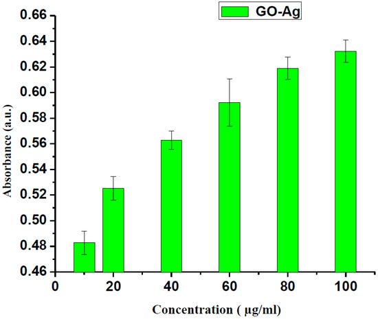 Graphene-based materials have distinctive physicochemical properties and are functional for several prospects. However, their biological properties in organisms will finally determine their destiny in the future. In many recent studies, researchers focused on cell surface adhesion biofilms. Numerous studies have shown that the biofilm phenotype can be described in terms of the genes expressed by biofilm-associated cells. The supramolecular self-assembly approach and their hybrid/complex forms were employed with a laser irradiation mechanism [44,45,46] for the successful implementation of targeted photothermal and photodynamic efficacy. The promising biomedical uses of graphene/silver nanocomposites have been considered for numerous applications, including antibacterial properties and nanocarriers for controlled stacking on drug delivery conveyance as an anticancer agent [47,48]. An organized study was performed to assess the lethality of GO-Ag to MCF-7 cells, a generally-utilized model cell line for toxicological study. The said nano-structural material was employed to decide the likelihood of cell demise because of mechanical stress/cell death. In this work, we attempted to follow the absorbance/optical density measurement by taking different concentrations of GO-Ag as explained in Figure 5 after an uptake time of 24 h. The current experimental study evaluated the optimal density/absorbance of usefulness of GO-Ag in a breast cancer cell line. In addition, it was found that by increasing the concentration of GO-Ag, the mean absorbance/optical density of the stated NPs increased to 0.6 a.u., which is significant, as shown in Figure 5. The results showed the dependency of the significant loss of cell viability and the enormous reactive oxygen species (ROS) liberation under laser light irradiation, which depicted the high profile cancerous cell/tissue injury via cell necrosis/apoptosis, respectively. These outcomes showed that GO-Ag revealed the concentration/dose dependent cytotoxicity with MCF-7 cells.