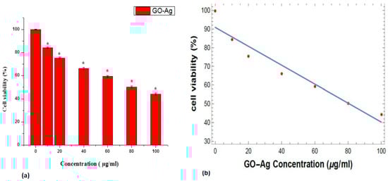 (a) Loss in cellular viability (%) in MCF-7 breast cell line treated with GO-Ag nanocomposites after 24 h, t-test (* p < 0.05) (b) Linear calibration Plot of GO-Ag vs. cell viability.