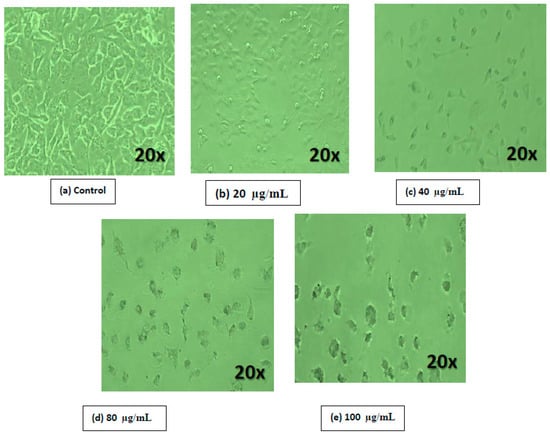 Previous studies showed that the use of graphene-related derivatives induced apoptosis in cancerous cells. Therefore, we examined whether the addition of the GO-Ag nanocomposite to MCF-7 cultures produced any pronounced effect on the cellular morphology [58]. In addition, to support the results of the cell viability assay, we further evaluated the effect of the GO-Ag nanocomposite on the cell morphology of breast cancer cells. Figure 7 shows a photomicrograph composite of the MCF-7 cells incubated for 24 h in the presence or absence (control) of GO-Ag nanocomposites. The control MCF-7 cells were appeared as large adherent cells, epithelial and having long arms, with indistinct cell borders. MCF-7 cells when treated with GO-Ag looked different from those of the control group. A reduced number of cells and a significant effect on the cell morphology were observed at different concentrations of GO-Ag, such as 20, 40, 80 and 100 μg/mL, as seen in Figure 7b–e respectively in the breast cancer cells. At higher concentrations, treated cells appeared as significantly less dense with shrunken arms. Similarly, Jaworski et al. [59] stated the variable toxicity of GO and rGO in glioma cells. In another study, an abridged amount of cells and a noteworthy outcome on the cell morphology were perceived in A2780 cells treated with GO. The GO-treated cells appeared slightly dissimilar from those of the control group [58].