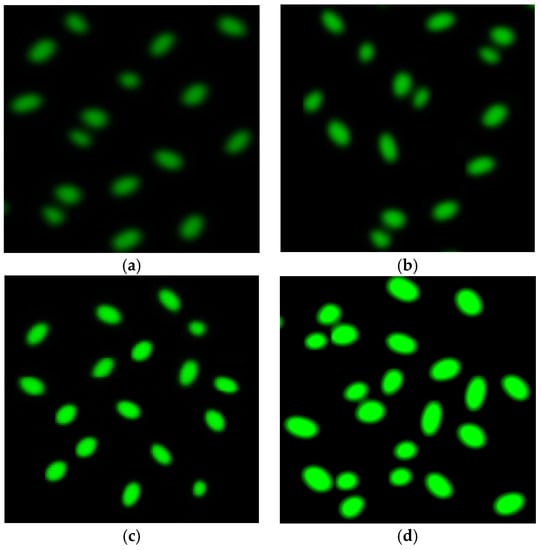 Intracellular ROS production was detected using the non-fluorescent compound CMH2DCFDA (Invitrogen Corporation, Carlsbad, CA, USA). The compound crosses the cell membrane and undergoes deactivation by esterases, producing the nonfluorescent CMH2DCF, which reacts with oxygen species inside the cell to produce highly fluorescent dye chloromethyl dihydro dichlorofluorescein (CMDCF). After inactivation of cells in different concentrations of GO-Ag with the recommended light dose, in humidified air with 5% of CO2 at 37 °C for 12 h, the cells were washed gently once in Dulbecco’s Modification of Eagle’s Medium (DMEM). Cells were loaded with 10 μM CMH2DCFDA incubated for 30 min at 37 °C and protected from light. Thereafter, cells were exposed to a light dose of 100 J/cm2 for 2 min to visualize for ROS production [38,39]. After delicate protocol, cells ROS fluorescence was captured with emission detection at 530 nm.