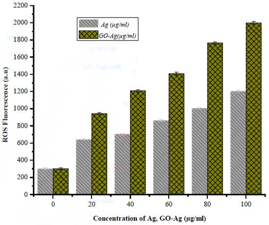 In Figure 9, depicted liberation of ROS is directly proportional to Ag alone and GO-Ag accumulation into biological model, but GO-Ag is more dominant as compare to individual Ag NPs when exposed to the biological cells. These results resembled with perfect agreement with previous published data [61,62,63], as longer as concentration increased, fluorescence Intensity were also increased. In addition, it is confirmed via manifold techniques that release of singlet oxygen (1O2) into the solution by the nanoparticles as described previously [57,58,59]. It was investigated that GO-Ag produced more oxygen stress in the tumorous targeted site due to less metabolic activity as compare to healthy part, in healthy tissue their enzymes stability and routine metabolic activity their immune system act as scavenging tool towards this new developed anticancer agent. Basically oxidative stress can cause of cell killing effect via damage proteins, DNA, and lipids, and is involved which precursor to many diseases. Damage to infected cells caused by oxidative stress is related to increased levels of ROS. During oxidative stress, hydrogen peroxide levels are often increased and catalase levels are decreased inside cells [53,62].