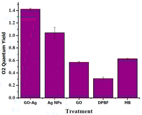 The release of 1O2 into aqueous solution was estimated indirectly by using the DPBF assay. DPBF reacts irreversibly with 1O2 causing a decrease in its absorption intensity at 410 nm. The different NPs (100 µg/mL) were mixed in DPBF solution and upon irradiation, absorption was measured over a period of time [41,42]. As shown in Figure 10, Quantum yield of only DPBF had a slight increase in the 1O2 production but methylene Blue produced a significant escalation in the 1O2 levels. Graphene Oxide too contributed to the significant increase in the 1O2 levels but its level was marginally lesser than that of MB. Silver NPs produced the similar induction of 1O2 that was significantly higher than graphene oxide alone. For GO-Ag nanocomposites a considerable stronger induction in 1O2 production was observed.
