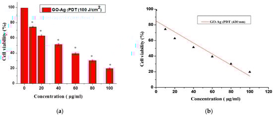 (a) Cellular viability of GO-Ag treated breast cell carcinoma using PDT (100 J/cm2), t-test (* p < 0.05); (b) Linear calibration Plot of GO-Ag vs. cell viability under PDT (100 J/cm2).