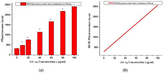 Kolarova et al. demonstrated that ROS overproduction can cause severe cell damage, which leads to cell death, and they made this statement after the investigation of the synergistic mechanism between sonodynamic therapy (SDT) and PDT by using MCF-7cells as an in vitro model [67]. To investigate the effect of the GO-Ag nanocomposite of different concentrations (10–100 µg/mL) on ROS generation under light irradiation of 430 nm, the results clearly indicated that GO-Ag profoundly exaggerated ROS generation when compared to control. It is clearly observed in Figure 12a, a significant rise in the fluorescence of ROS production was observed under laser irradiation parameters and is statistically significant (p < 0.05, t-test). The statistical analysis for ROS generation after treatment with GO-Ag concentrations was plotted under light irradiation of 100 J/cm2, showing the linearity using regression equation analysis (Y = 342.65 + 19.677X) of the calibration data (n = 7) as seen in Figure 12b. The intercept had a value of 342.65 with a positive slope of 19.677, and the standard error for the slope in regression is (Std err = 278.4517). The other parameters included the standard deviation (SD = 662.4739), the correlation coefficient (r2 = 0.9357) with a p-value = 0.0025 and t-statistics value (ts = 4.2764) and t-critical value (tcrit = 1.942) showing the significance of results as tcrit < ts. Hence statistical results corroborated the accuracy of the experimental data.