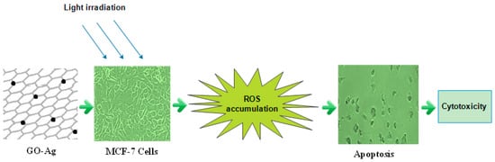 The present study exhibited that GO-Ag under a suitable wavelength of light exposure not only liberated reactive oxygen species (ROS), but also arrested the cell cycle by the inhibition MCF-7 cells proliferation through encouraging oxidative stress, which would be valuable for developing highly operative graphene-related aggregates for use in biomedicine [58,63,64]. Its schematic diagram is presented below in Figure 13.