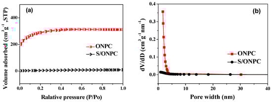 Figure 1a reveals the nitrogen adsorption/desorption isotherms of the ONPC and the S/ONPC composite. The ONPC exhibits typical type I isotherms with unapparent hysteresis loop, indicating the micro/mesopore structure of the ONPC [15,19]. Figure 1b presents the pore size distribution (PSD) curves of the ONPC and the S/ONPC composite. From the PSD curve of the ONPC, the micro/mesopore structure is also evident. The Brunauer-Emmett-Teller (BET) surface areas, pore volumes, and the micropore surface areas of the ONPC and the S/ONPC composite are summarized in Table 1. As listed in Table 1, the surface area of ONPC was 1017.5 m2·g−1 with the pore volume of 0.48 cm3·g−1. After the impregnation of sulfur, the surface area of the S/ONPC composite was only 22.4 m2·g−1 with the pore volume of 0.015 cm3·g−1. The significant reduction in surface area and pore volume is mainly ascribed to the encapsulation of a large amount of sulfur in ONPC. In general, the ONPC possesses a large pore volume and abundant specific surface area, which could effectively retard the diffusion of polysulfides and diminish the shuttle effect in the charge/discharge process of an Li/S battery [20,21].