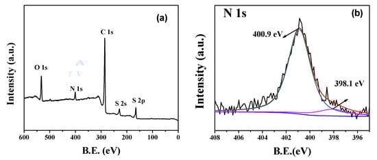 The XPS spectra were used to determine the surface chemistry of the S/ONPC composite. The XPS survey spectra of S/ONPC (Figure 2a) shows five peaks centered at 163.6, 227.6, 286.4, 401.5, and 532.8 eV, which can be assigned to S2p, S2s, C1s, N1s, and O1s, respectively. As shown in high-resolution N1s spectra (Figure 2b), the N1s spectrum can be fitted into two individual peaks with binding energies of 400.9 and 398.1 eV, corresponding to graphitic-N and pyridinic-N [22]. It is reported that the doped nitrogen may enable an improvement of the electric conductibility, the wettability in the electrolytes, and the adsorption of polysulfides on the carbon matrix [11,23]. As for the C1s spectrum of the S/ONPC composite (Figure 2c), three peaks at 288.5, 285.8, and 284.6 eV can be associated to O–C=O, C–N/C–S, and C–C/C–N bonding, suggesting that oxygen-functional groups exist in the S/ONPC composite [24]. According to the report, the existence of oxygen-containing functional groups can favor the binding ability of lithium polysulfides and improve the utilization of active materials, leading to a good cycling ability for Li/S batteries [25]. The S2p binding energy peak of the S/ONPC composite can be separated into three peaks, including the S2p 3/2 peak (163.8 eV), S2p 1/2 peak (164.9 eV), and C–SOx (168.5 eV), as shown in Figure 2d [26]. The XPS results show that the S atoms are chemically bonded to the ONPC, which could effectively immobilize sulfur, inhibit the diffusion of soluble polysulfides, and thus improve the electrochemical performance of the S/ONPC composite.