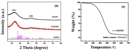 Figure 3a shows the XRD patterns of the as-prepared ONPC and the S/ONPC composite. It can be seen that the ONPC demonstrates two broad peaks located at 23.4° and 43.4°, which are assigned to the (002) and (100) planes of the graphite lattice [27]. The partially graphitized structure can improve the conductivity of the ONPC, thereby favoring the rate ability of the S/ONPC [28]. The S/ONPC composite exhibits a similar XRD pattern to ONPC with no obvious crystalline sulfur peak (JCPDS No. 08-0247) [29], suggesting that the sulfur has an amorphous phase and is homogeneously distributed in the internal pores of ONPC [29]. To illustrate the actual content of sulfur, the thermogravimetric analysis (TGA) of the S/ONPC was carried out under a nitrogen atmosphere. Figure 3b shows the TG curve of the S/ONPC composite. It can be seen that the S/ONPC delivers a significant weight loss between 200 and 450 °C due to the evaporation of sulfur, and the actual sulfur content is calculated to be 47.6 wt %. The temperature at which sulfur evaporates is higher than that of the nitrogen undoped carbon/sulfur composites (200–330 °C) reported in previous studies [30], which may arise from the great encapsulation capability of nanoporous properties and the strong interaction between the sulfur and the oxygen/nitrogen atoms.