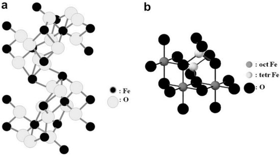 Crystal structures of (a) hematite and (b) magnetite. Reproduced with permission from [3]. Elsevier, 2009.