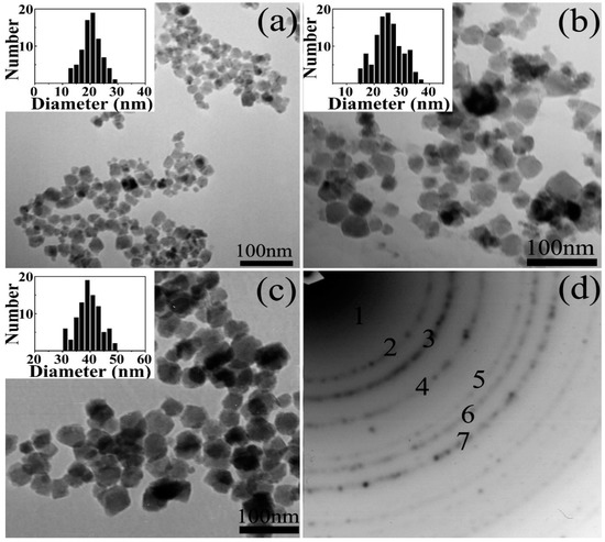 (a–c) TEM images and size distributions of Fe3O4 nanoparticles (NPs) with the different mean diameters of 20 nm, (a) σ = 16%, 25 nm (b) σ = 19% and 40 nm (c) σ = 10%. The size distributions show that the synthesized Fe3O4 NPs had a narrow size distribution. (d) Electron diffraction (ED) patterns of the 20-nm Fe3O4 NPs. Reproduced with permission from [27]. American Chemical Society, 2008.