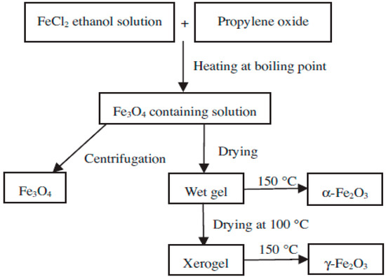 Generalized scheme for the preparation of α-Fe2O3, γ-Fe2O3 and Fe3O4 nanoparticles. Reproduced with permission from [29]. Elsevier, 2013.