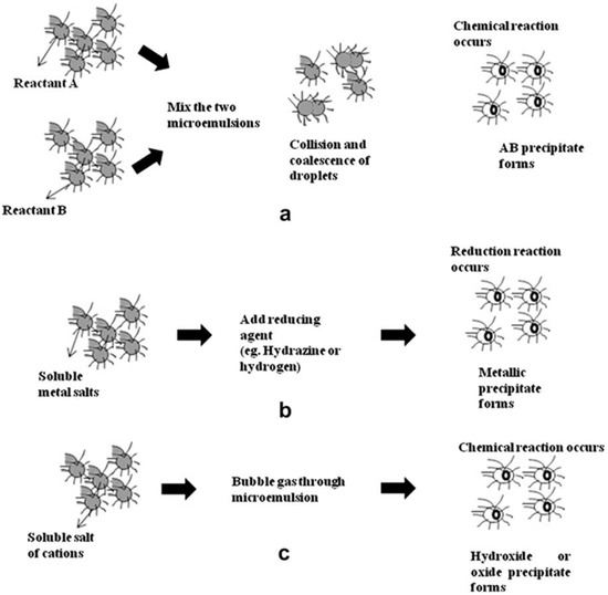 Schematic representation of nanoparticle synthesis in microemulsions (a) by mixing two microemulsions; (b) by adding a reducing agent; and (c) by bubbling gas through the microemulsion. Reproduced with permission from [3]. Elsevier, 2009.