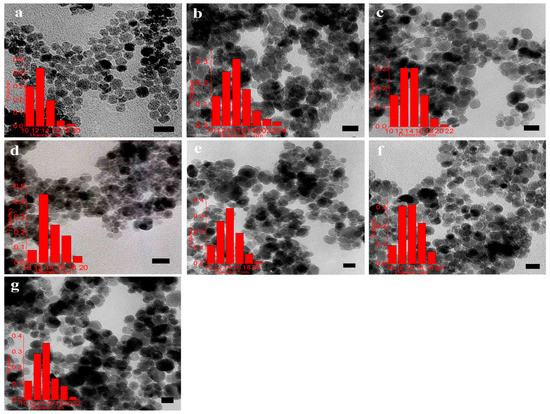 TEM micrographs and size histograms for Fe3O4 nanoparticles prepared by microemulsion method at 70 °C in (a) SDS; (b) Brij30; (c) DTAB; (d) DEAB; (e) DBAB; (f) CTAB; (g) 12-2-12. The scale bar is 20 nm. Reproduced with permission form [34]. Elsevier, 2013.