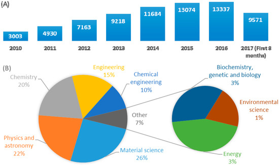A comparative demonstration of published papers (since 2010 to date) according to Scopus data base searching “graphene” in title. (A) published papers since 2010; (B) categorized published papers in the first 8 scientific areas according to number of papers.