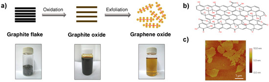 (a) Chemical route to synthesize aqueous graphene dispersions; (b) The expected chemical structure of a single sheet of graphene oxide (GO); (c) AFM (atomic force microscopy) image of the GO on a silicon substrate showing an average thickness of around 1 nm. Reproduced with permission from [45]. Royal Society of Chemistry, 2012.