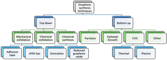 In bottom-up approach, products are synthetized from smaller building blocks (Figure 10). Bottom-up methods encompass standard techniques including epitaxial growth using metallic substrates by means of chemical vapor deposition (CVD) or organic synthesis, which depends on the choice of precursor chemicals and thermal degradation and decomposition of the SiC [38,50].