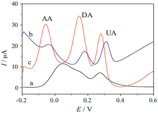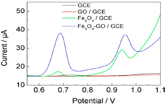 Dopamine, DA, uric acid, UA and ascorbic acid, AA, coexist in human body and are among the most abundant biomolecules in blood. Therefore, simultaneous determination of DA, UA and AA is very important for the diagnostic research [129]. However, since all of these three biomolecules are easily oxidized, simultaneous determination is often faced difficulty due to overlapping oxidation potentials. Wu et al. [130] resolved this problem by using amino-group functionalized Fe3O4, Fe3O4-NH2, combined with graphene sheets, GS. Figure 13 shows that three well separated peaks are observed using the modified glassy carbon electrode, Fe3O4-NH2@GS/GCE. Facile solvothermal method was used for preparing of this composite by heating the mixture in an autoclave for 8 h at 200 °C, which was resulted in producing of Fe3O4-NH2 nanostructures anchored GS with average size of 45 nm. Linear dynamic ranges for the determination of AA, DA and UA were 5.0–1600, 0.2–38 and 1.0–850 µmol·L−1 under optimum conditions, respectively. Acceptable recoveries in different samples such as DA hydrochloride injection, vitamin C injection and human urine revealed the ability of proposed sensor for application in field.