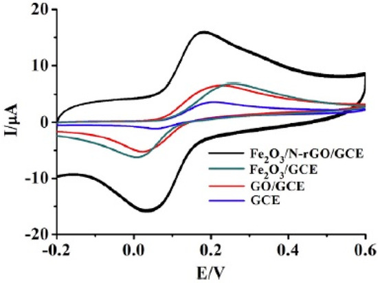 Fe2O3-nitrogen-doped reduced graphene oxide, Fe2O3/N-rGO, was synthesized for enhanced electrochemical determination of dopamine (DA) by Yang et al. [13]. A simple one-step hydrothermal method was used for preparation of nanocomposite in which ethylenediamine served simultaneously as nitrogen source, reducing agent and coordinating agent. Therefore, nitrogen doping and reduction of graphene oxide and producing of Fe2O3 were occurred in one step. Using this composite for modification of electrode resulted in a higher current (Figure 14). However, charging current had significant share in this current increasing that is not desired for this sensor. Linear range of 0.5 µM–0.34 mM and detection limit of 0.49 µM were reported for this sensor along with capability for determination of DA in dopamine hydrochloride injection as real sample.