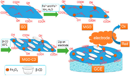 Preparation of β-CD-GO/Fe3O4 (MGO-CD) nanocomposites and the β-CD-GO/Fe3O4/GCE (MGO-CD/GCE). Reproduced with permission from [131]. Elsevier, 2016.