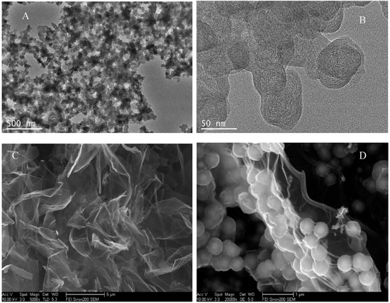 Scanning electron microscopy (SEM) images of (a) GO; (b) Fe3O4 NPs; (c) RGO-Fe3O4 nanocomposite and (d) RGO-Fe3O4/Gox nanocomposite. Reproduced with permission from [78]. Elsevier, 2017.