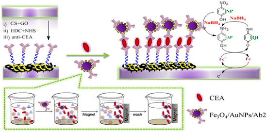 - Li, Y.; Zhang, Y.; Li, F.; Li, M.; Chen, L.; Dong, Y.; Wei, Q. Sandwich-type amperometric immunosensor using functionalized magnetic graphene loaded gold and silver core-shell nanocomposites for the detection of Carcinoembryonic antigen. J. Electroanal. Chem. 2017, 795, 1–9. [Google Scholar] [CrossRef]