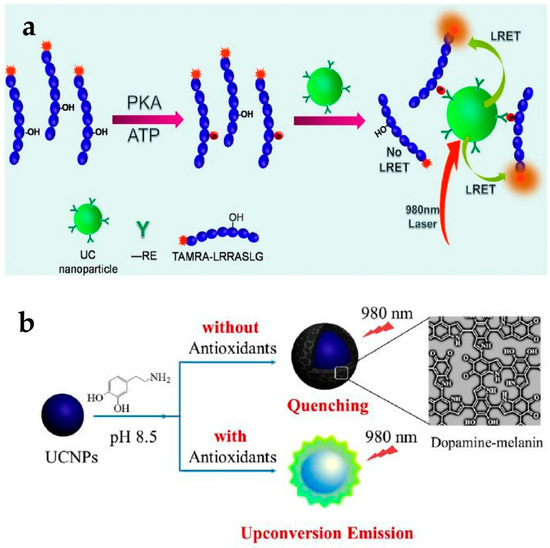 (a) Principle of protein kinase A (PKA) detection based on upconverting NP (UCNP) LRET assay; (b) Schematic representation of antioxidant assay based on UCNPs with dopamine. Reprinted with permission from [24,53].