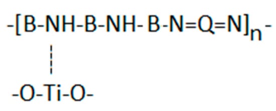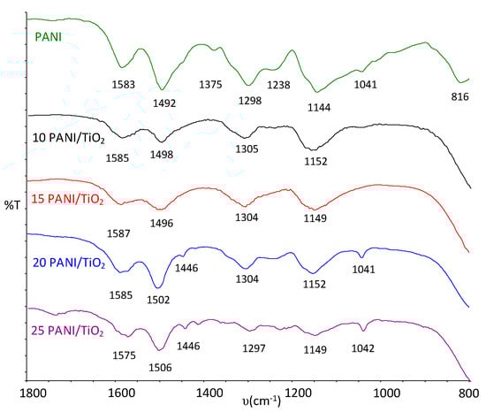 Figure 1 shows the presence of the TiO2 particles that decreased transmission values at wavenumbers lower than 900 cm−1. However, vibration modes at 3630–3680 cm−1 and 3500–3420 cm−1, typical for stretching and bending vibrations of –OH groups at the TiO2 surface [23], were not observed in this work (not presented). Furthermore, Figure 1 indicates that the characteristic PANI peaks of C=N, C=C and C–N (1583 cm−1, 1492 cm−1, 1298 cm−1) in the 15PANI/TiO2 composite were shifted to higher wavenumbers (1587 cm−1, 1496 cm−1 and 1304 cm−1). Titanium, as a transition metal, has a tendency to form a coordination compound with nitrogen atoms (Ti–N) which could weaken the strength of the C=N, C=C and C–N bands, that shift typical PANI bands to higher wavenumbers [24]. Thus, the shift of the characteristic PANI peaks in 15PANI/TiO2 indicates the presence of PANI-TiO2 interactions that are obtained through Ti–N interactions (Scheme 2).