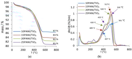 The first stage, which was similar for all samples, can be attributed to water loss up to 160 °C. The second stage, from 160 °C to 400 °C shows the removal of dopant and imperfections (i.e., oligomers and products with amino groups in the ortho-position) [25]. Finally, the third stage (from 400 °C) is characterized by thermal decomposition (i.e., stability) of the main PANI chains [26]. It is well-known that conductive PANI begins to decompose at 370 °C under air conditions [27]. However, in nitrogen (vs. air) atmosphere, the PANI chain structure decomposes at higher temperatures (>400 °C) which indicates greater thermal stability (Figure 2b) [13,25,28]. The dTG curves show that the 25PANI/TiO2 sample, with the highest shoulder, experienced the most significant mass loss in the second stage, due to the highest concentration of dopants and imperfections (Figure 2b).