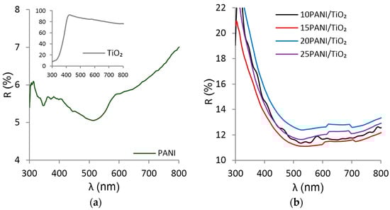 UV-Vis spectroscopy was used to characterize the synthesized PANI/TiO2 composite photocatalysts (Figure 3). The inset in Figure 3a indicates that pure TiO2 reflected >80% of the light in the Vis region (400–800 nm) in contrast to the pure PANI that reflected ≈6% (Figure 3a). However, the reflectance values of the PANI/TiO2 composites varied between those two extremes (i.e., pure PANI and pure TiO2). As PANI/TiO2 composites reflected a lower percentage of light than pure TiO2, it can be concluded that PANI was immobilized at the TiO2 surface.