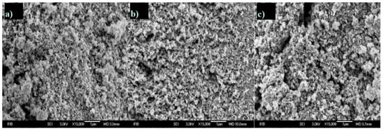 SEM micrographs of (a) 10PANI/TiO2; (b) 15PANI/TiO2 and (c) 20PANI/TiO2 composites (magnification ×15,000).