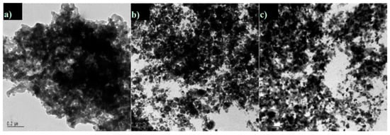 The morphology of the 10–20PANI/TiO2 composites was analysed by FE-SEM and TEM and the micrographs are shown in Figure 4 and Figure 5. The SEM micrographs demonstrate composite aggregates of an average size of 200–1000 nm (Figure 4a–c), while the smallest ones (≈200 nm) are visible in the 15PANI/TiO2 composite (Figure 4b). Interestingly, the pure PANI agglomerates were not detected in Figure 4b, which agrees with conclusions that PANI in 15PANI/TiO2 mainly covers the TiO2 surface (see Section 3.4). Furthermore, the TEM images show that the aggregates are comprised of TiO2 particles with an average size of 10–20 nm (Figure 5a–c). The aggregate composition presented in Figure 5a–c corroborates previous literature reports [32], in which authors showed that the small (10–20 nm) TiO2 particles form large PANI/TiO2 aggregates.