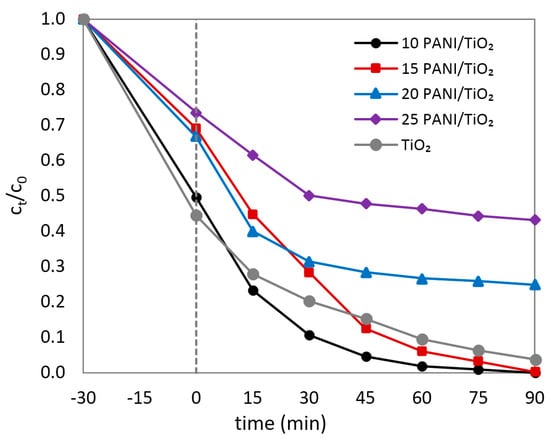Figure 6 shows that pure TiO2 presented the highest ability to adsorb the dye, due to having the highest specific surface. On the other hand, the highest adsorption capacity was observed for 10PANI/TiO2, whilst the lowest adsorption capacity was detected for 25PANI/TiO2. However, the composites’ adsorption abilities are also governed by the chemical interaction of the negative anionic dyes (pH = 4) with the positively charged PANI chain [34]. Thus, differences in the composites adsorption abilities can be attributed to both the different structure of the PANI chain and to the different PANI ratio.
