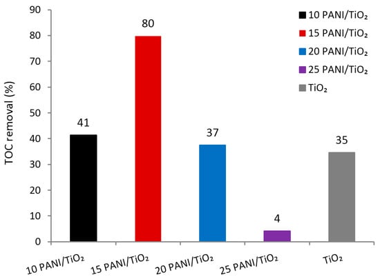 Comparison of total organic carbon (TOC) removal of Reactive Red 45 (RR45) dye after 90 min of photocatalysis (UVA) with TiO2 and PANI/TiO2 composite photocatalysts (pH = 4; γcat = 1 g/L, γRR45 = 30 mg/L).