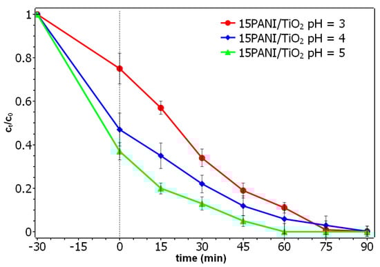 Concentration change of RR45 dye during photocatalysis (UVA) with the 15PANI/TiO2 composite photocatalyst at various pH values (pH = 3, 4, 5; γcat = 1 g/L, γRR45 = 30 mg/L).