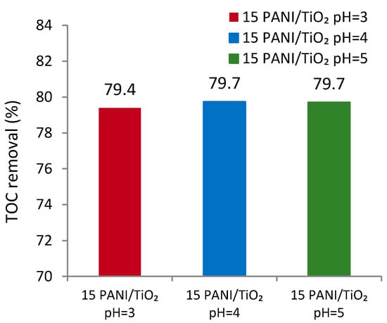 Figure 8 presents the influence of pH on the photocatalytic degradation of RR45, using the 15PANI/TiO2 catalyst. The lowest dye adsorption (33%) was obtained at pH 3, as PANI is doped at pH = 3 [16], and thus, the HSO4− ions prevented dye adsorption. After 90 min of UVA treatment, regardless of pH, the 15PANI/TiO2 photocatalyst yielded complete discoloration, as confirmed by TOC removal (Figure 9). The TOC results were almost identical, despite the pH values (≈80%), though a different RR45 degradation rate was obtained. A complete discoloration of RR45 was achieved in 60 min at pH 5, after 75 min at pH 3 and in 90 min at pH 4. Considering the obtained results and the fact that pH = 5 is more environmentally “friendly”, this value was further used in the study.