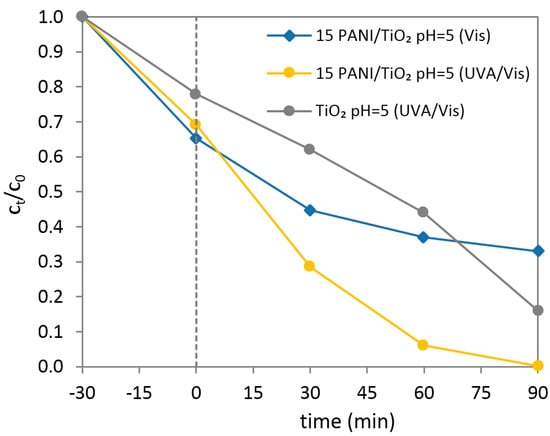 It is known that TiO2 is an excellent catalyst under UVA irradiation and a very poor one under solar (UVA/Vis) irradiation [39]. Therefore, to show that an improved 15PANI/TiO2 photocatalytic activity is a result of the PANI-TiO2 synergic effect, the RR45 degradation was conducted under UVA/Vis and Vis irradiation (Figure 10). The glass filter was used to reduce the amount of UVA irradiation. However, it is assumed that a small portion of UVA reached the composite surface.