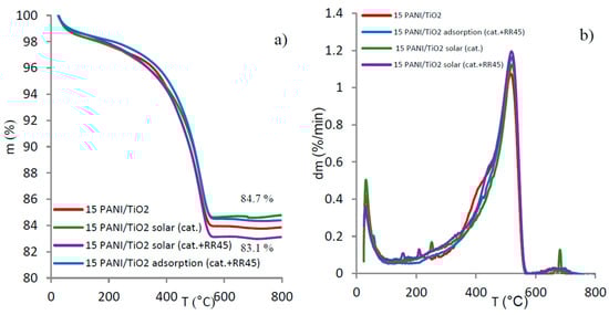 It should be noted that radicals, produced by solar irradiation [13], might induce severe PANI degradation. However, TG curves in Figure 11 reveal that the remaining char residue values varied between 83.1% and 84.7%, which indicates that the catalysts did not experience any significant degradation. Diversity in sample weight loss can be attributed to different dopant and moisture contents and to a different amount of adsorbed degradation products. The composites investigated at pH 5 (Figure 11) did not show shoulders around 400 °C (which were observed in Figure 2), since dopants were removed during photocatalytic tests. Therefore, it can be concluded that the synthesis condition for 15PANI/TiO2 synthesis was optimal, as the series of tests confirmed the stability of PANI in the composite.