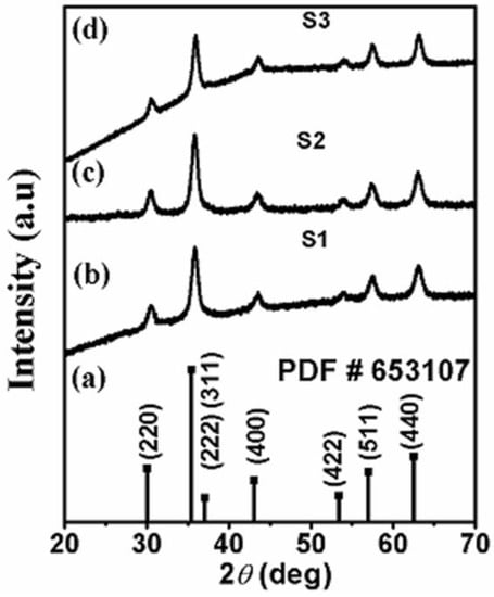 (a) The JCPDS data and the X-ray diffraction (XRD) patterns of Fe3O4–γ-Fe2O3 core–shell nanoparticles for samples (b) S1; (c) S2; and (d) S3.