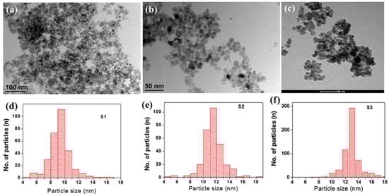 The transmission electron microscopy (TEM) images of samples (a) S1; (b) S2; and (c) S3. The particle size histograms of the samples (d) S1; (e) S2; and (f) S3.
