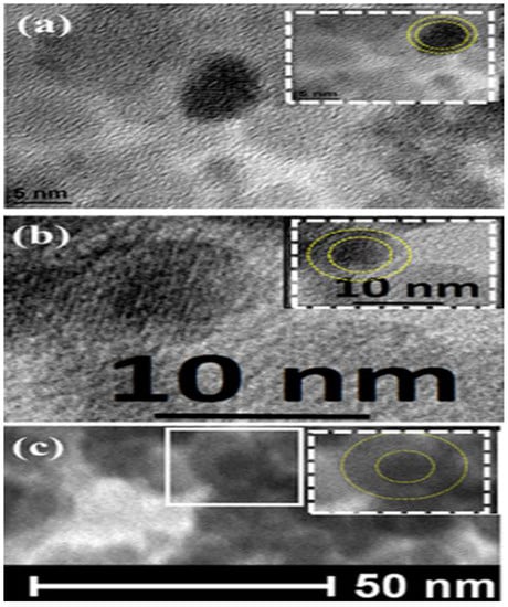 The average core and shell dimensions were obtained from several HRTEM images. The core–shell structure is well displayed where the core appears darker than the shell. The average dimensions of the cores and shells were calculated form several HRTEM images. All the samples were found to have the same average core diameter of approximately 8 nm. The average shell thicknesses for samples S1, S2, and S3 were found to be 1, 3, and 5 nm, respectively. In the insets of Figure 3, the dotted lines were drawn at the core–shell interface as well as the surface of the nanoparticle as guides for the eye.